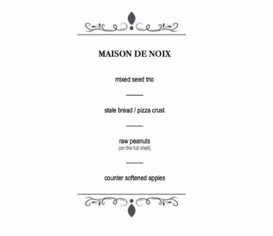 “Προσφέραμε ένα πρώτο πιάτο με ένα μείγμα σπόρων, ακολουθούμενο από φιστίκια με ολόκληρο το κέλυφος, κριτσίνια ψωμιού κομμένα στο σπίτι, και ένα επιδόρπιο με μήλα που έχουν μαλακώσει στον πάγκο”, δήλωσε ο Vreeland στο The Dodo.