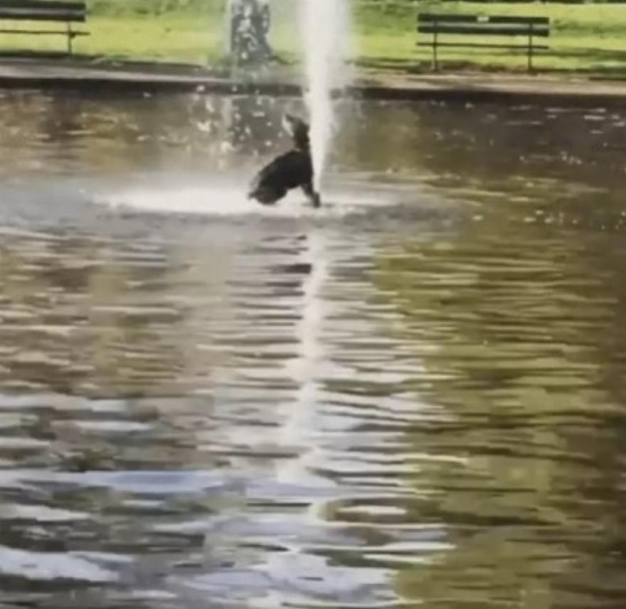 Καθώς περνούσαν από ένα μεγάλο, ρηχό σιντριβάνι στο πάρκο, η Μπέλα ξέφυγε. Το θέαμα του νερού που αναβλύζει ήταν πολύ δελεαστικό για να το προσπεράσει.