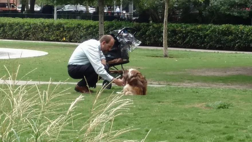 Ένας καλός άνθρωπος που γονατίζει για να βοηθήσει έναν σκύλο και ένα καροτσάκι μωρού χωρίς μωρό! Αυτό ήταν που υπήρχε στη φωτογραφία του Νταγκ.