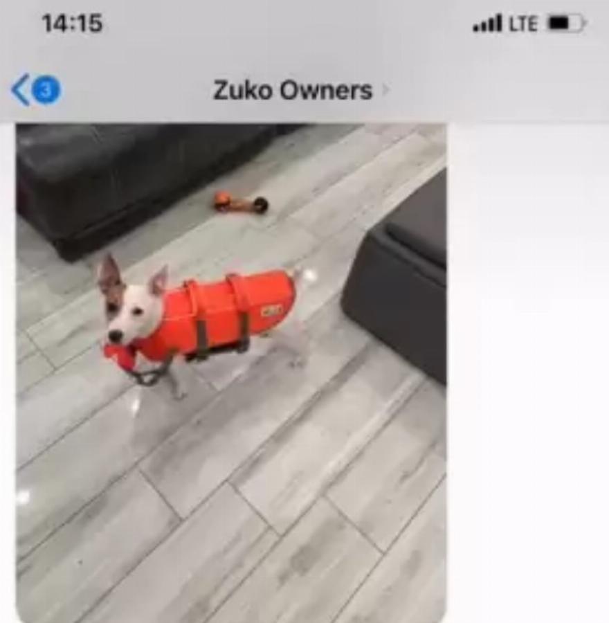 Οι ιδιοκτήτες του Ζούκο έστειλαν επίσης μια φωτογραφία από μια νέα αγορά που είχαν κάνει, η οποία θα βοηθήσει να διασφαλιστεί η ασφάλεια του Ζούκο όταν βρίσκεται στο νερό στο μέλλον.