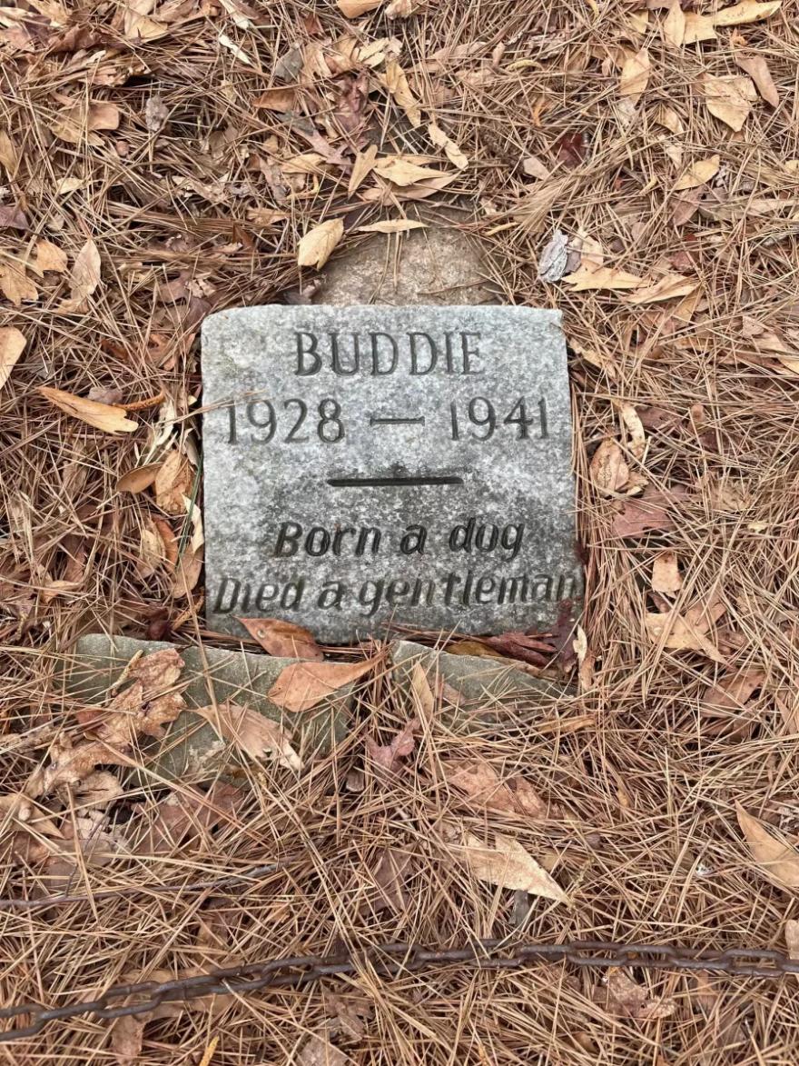 Η επιγραφή έγραφε: “Η επιγραφή έγραφε: “Η επιγραφή έγραφε: “Η επιγραφή έγραφε: “Buddie, 1928 – 1941. Γεννήθηκε ως σκύλος / Πέθανε ως κύριος”.