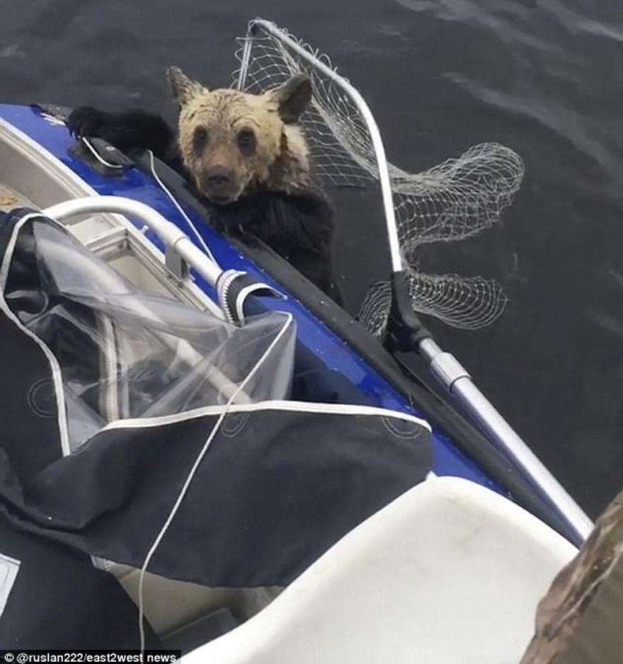 Το αρκουδάκι -με τη βοήθεια του Ανθρώπου και ενός διχτυού- καταφέρνει τελικά να σκαρφαλώσει στη βάρκα.
