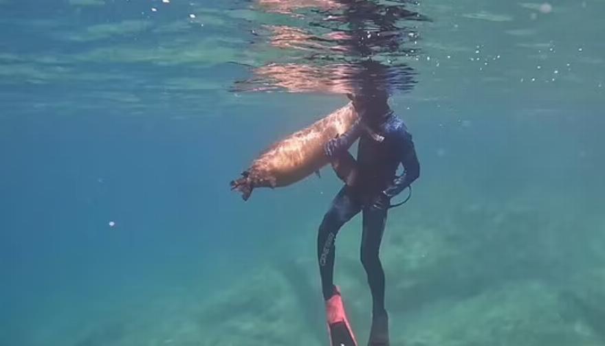 Ο Ethan κολύμπησε μαζί με το θαλάσσιο λιοντάρι στον κόλπο της Καλιφόρνιας και το άφησε να τον ελέγξει για περίπου 30 δευτερόλεπτα – τον αγκάλιασε μάλιστα μερικές φορές.
