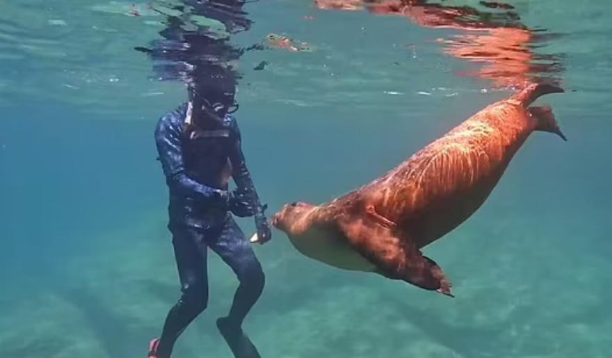Το βίντεο, που τραβήχτηκε, δείχνει το θαλάσσιο λιοντάρι να δαγκώνει παιχνιδιάρικα ένα αδέσποτο κομμάτι της στολής κατάδυσης του εφήβου, πριν κολυμπήσει γύρω του λίγο ακόμα.