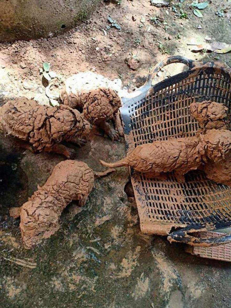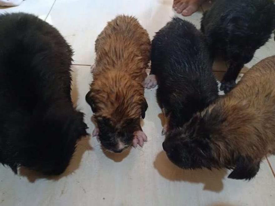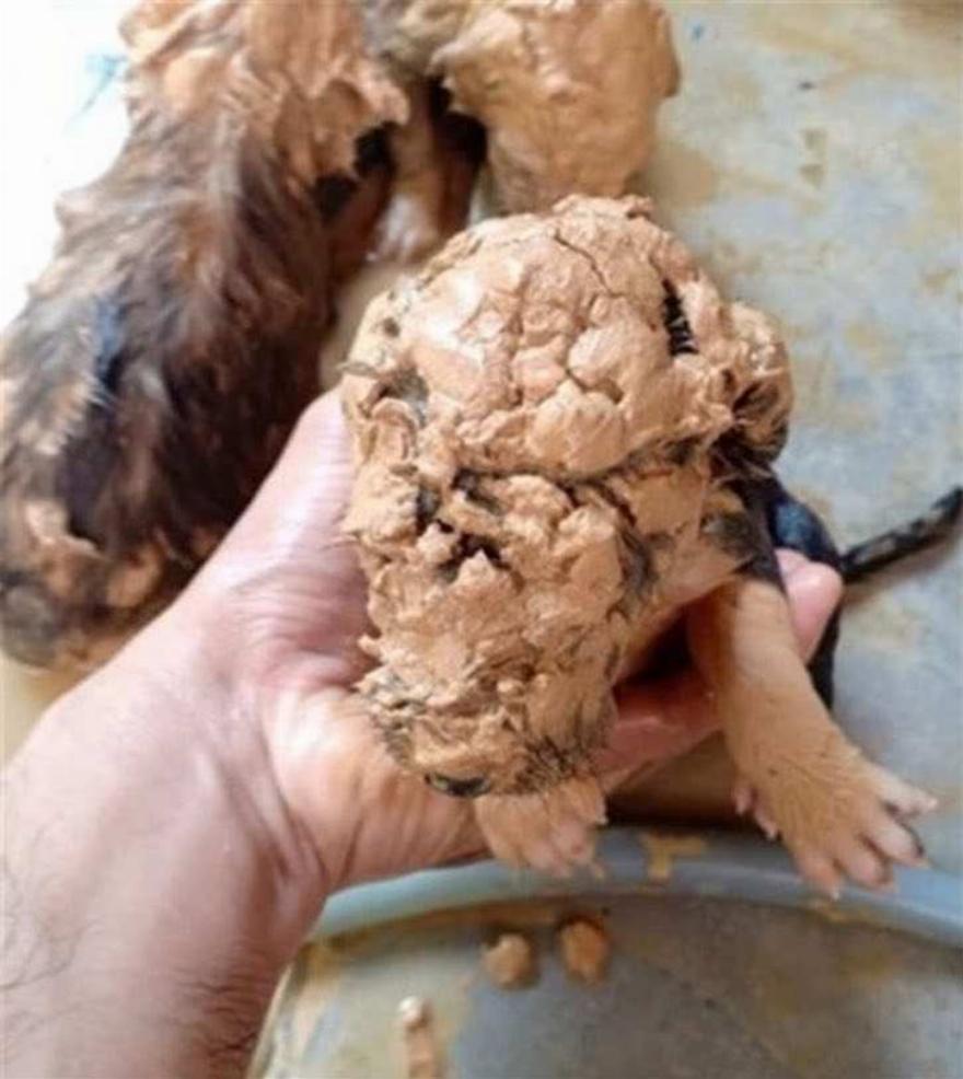 Σήκωσε τη σχάρα όπου δεν μπορούσε να δει τίποτα, παρά μια πολύ συσσωρευμένη λάσπη, αλλά το κλάμα συνεχίστηκε, οπότε έπρεπε να μπει στο αποχετευτικό δίκτυο για να δει αν θα έβρισκε κάτι. Δεν χρειάστηκε πολύ ώρα για να συναντήσει κάτι τρομερό: 5 νεογέννητα κουτάβια με λάσπη παγιδεύτηκαν, φωνάζοντας απεγνωσμένα για βοήθεια.