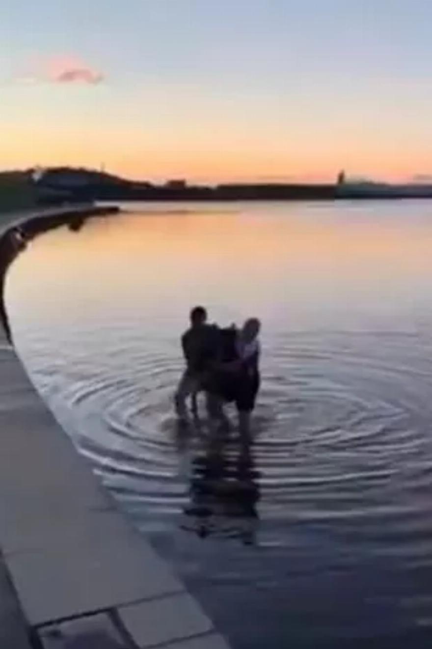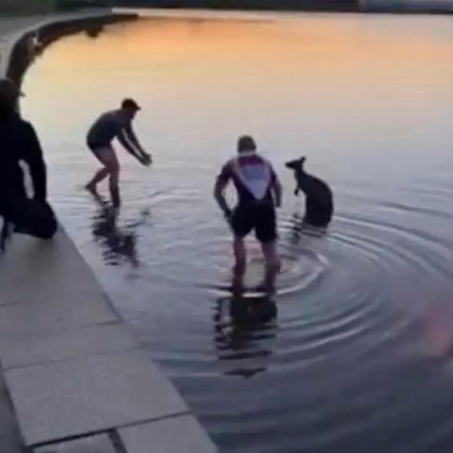 Κρατώντας το ζώο ανάμεσά τους, οι δύο άνδρες περπατούν μέχρι την άκρη της λίμνης, όπου στη συνέχεια περνούν το καγκουρό μέχρι έναν τρίτο άνδρα που περιμένει στο πεζοδρόμιο που περιβάλλει το νερό.