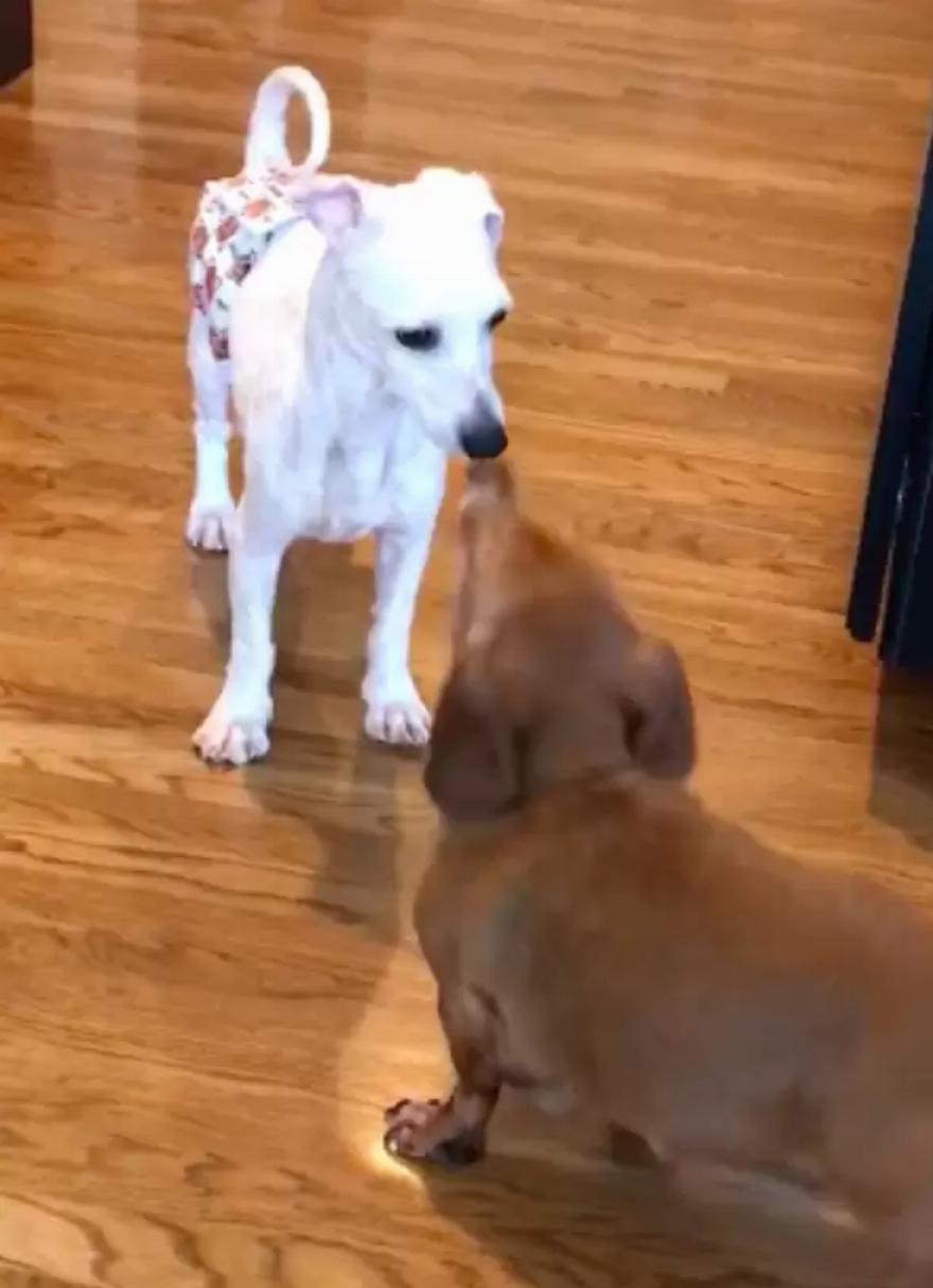 Πρώτον, συνειδητοποίησε ότι τα άλλα σκυλιά στο σπίτι -μια ομάδα που αποτελείται από ανάδοχους και κουτάβια που έχουν φιλοξενηθεί για πάντα- είναι ανέμελα και χαρούμενα.