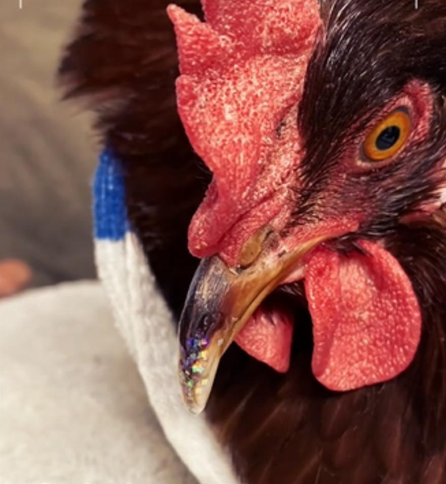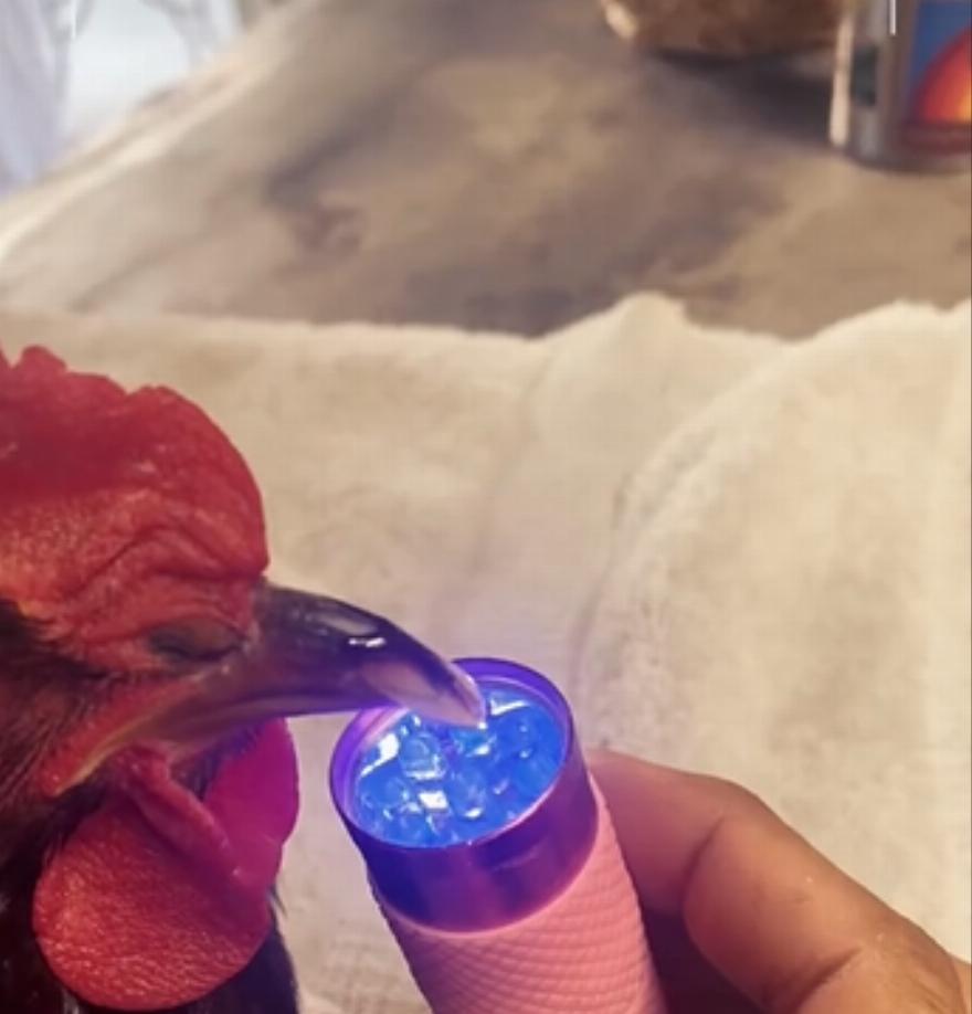 Ο λογαριασμός TikTok του @Christierhae δημοσιεύει: “Αυτή η κότα είχε ένα υπερτροφικό πάνω ράμφος που είχε σχιστεί και δυσκολευόταν να φάει ή να πιει. Έτσι το περιποιήθηκα και έφτιαξα μια νέα άκρη ράμφους με σκληρό τζελ και γκλίτερ”.