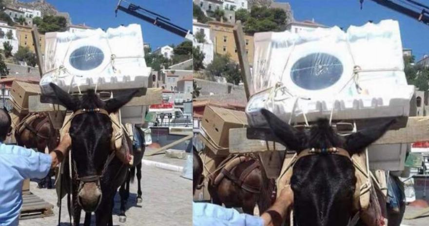Έξαλλοι είναι οι χρήστες του Facebook με τη φωτογραφία που κυκλοφορεί η οποία δείχνει ένα μουλάρι στη Σαντορίνη να κουβαλάει ένα πλυντήριο στην πλάτη του.