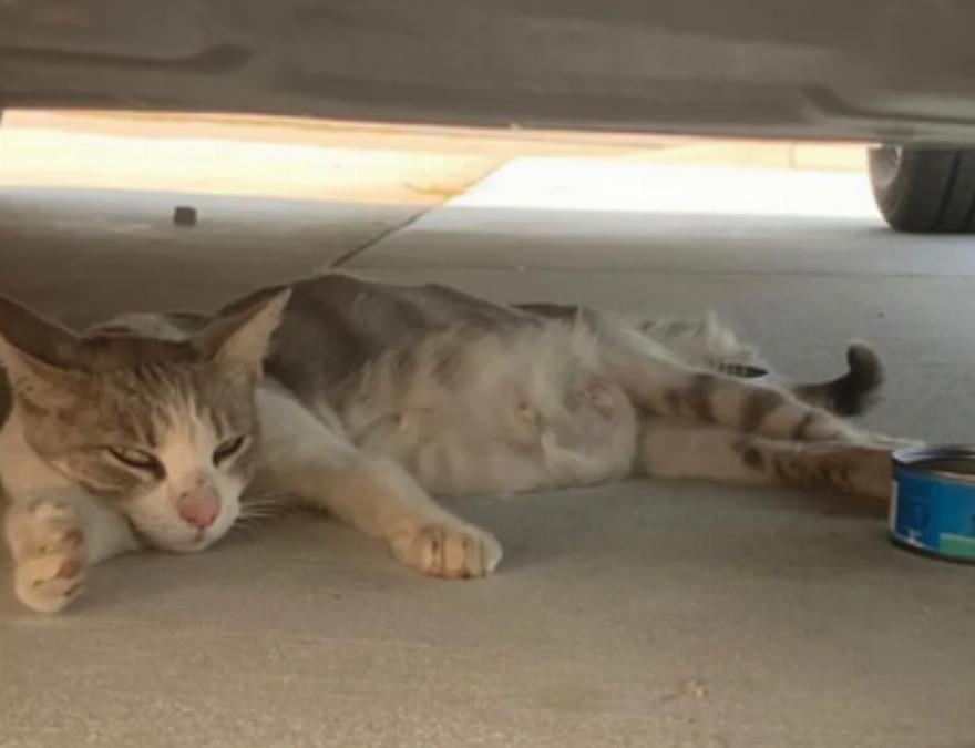 Μια αδέσποτη γάτα εμφανίστηκε σε μια γειτονιά του Moreno Valley της Καλιφόρνια, ψάχνοντας για φαγητό. Περιπλανήθηκε στην αυλή μιας οικογένειας, όπου της προσφέρθηκε φαγητό για να γεμίσει την κοιλιά της.