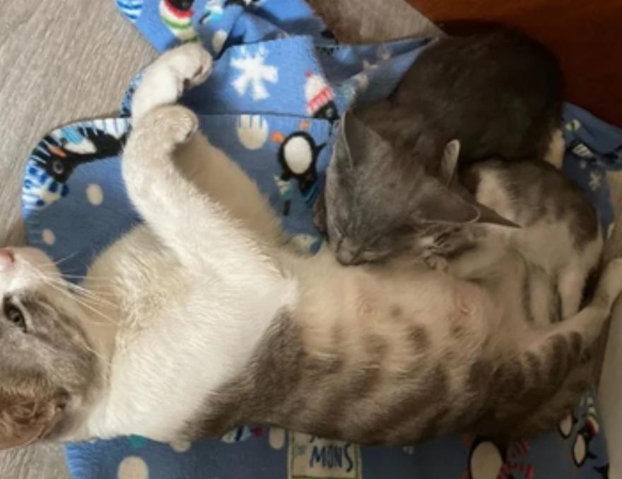 Η γλυκιά γατίσια οικογένεια εγκαταστάθηκε στη νέα της κατοικία και έτρωγε με την καρδιά της. Τα γατάκια εξερεύνησαν κάθε γωνιά του δωματίου τους, ενώ η μαμά τους κοιμόταν ικανοποιημένη στο άνετο νέο της κρεβάτι.