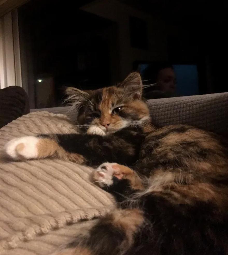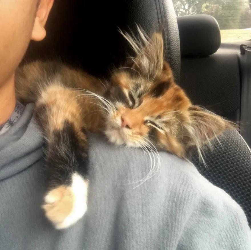 Η μικρή calico γρήγορα αγάπησε με τον ανθρώπινο φίλο της και τον άφησε να την πάρει στην αγκαλιά του για προσοχή και χάδια. Εκείνος ήταν εντελώς ερωτευμένος μαζί της και την ονόμασε Tuna.