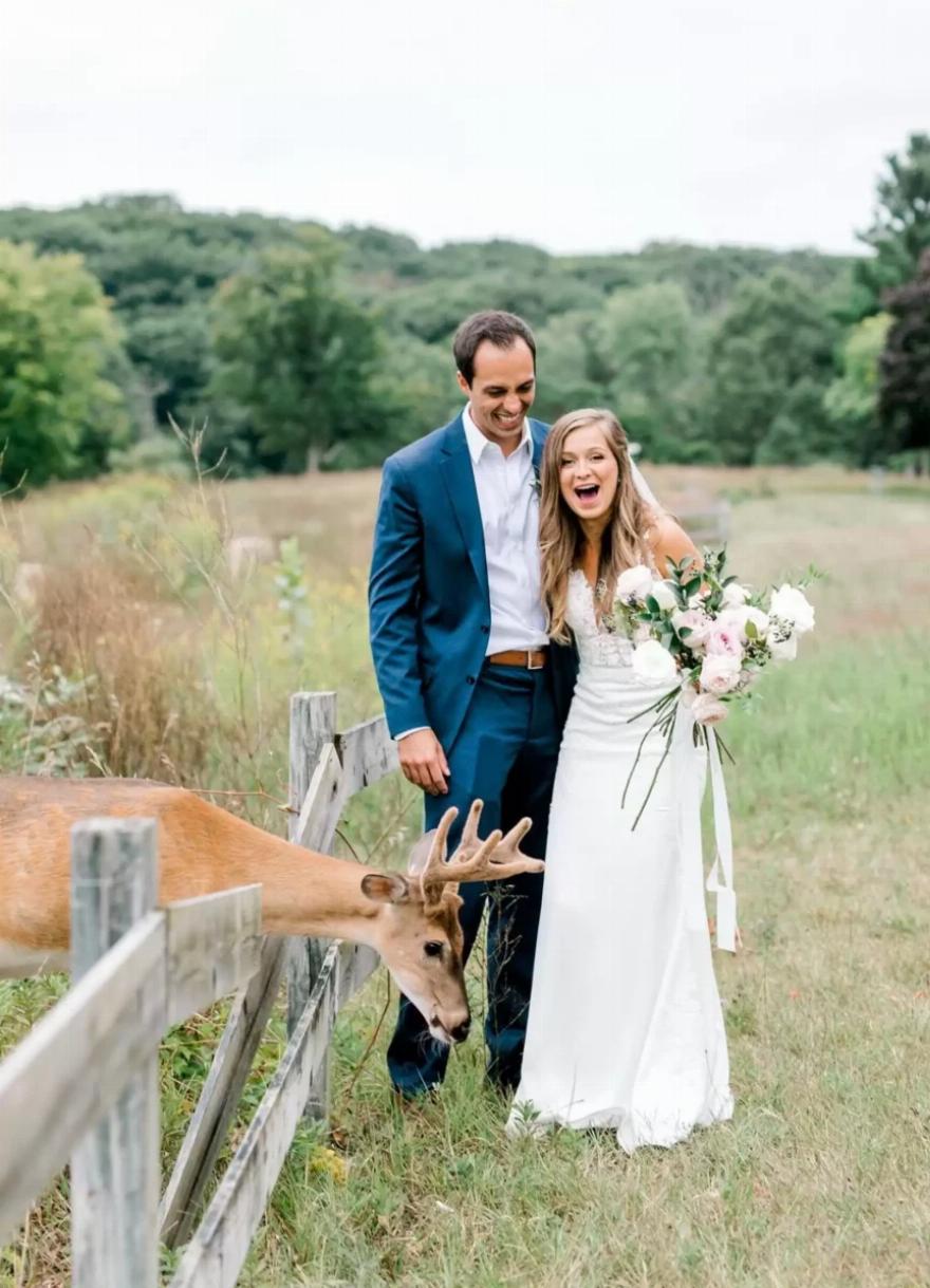 “Περπατήσαμε πάνω από αυτόν τον λόφο και φτάσαμε σε ένα χωράφι όπου είδαμε ακριβώς πίσω από έναν ξύλινο φράχτη ένα ελάφι”, δήλωσε η Bennett στο The Dodo. “Μόλις φτάσαμε, το ελάφι κοίταξε ψηλά και απλά περπάτησε χαλαρά προς τη νύφη και τον γαμπρό”.