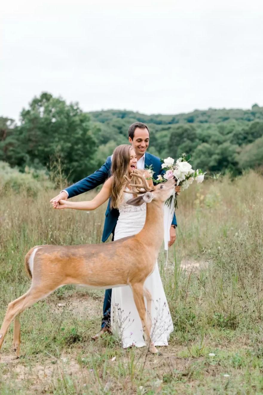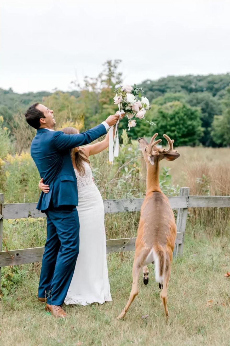 Το ελάφι δεν θα σταματούσε μπροστά σε τίποτα για να πάρει τα λουλούδια, οπότε η νύφη αποφάσισε τελικά να δώσει στο πεινασμένο ζώο την ανθοδέσμη της. Χρειάστηκε να δανειστεί μια από τις συνθέσεις των παρανύμφων για το πέταγμα της ανθοδέσμης – αλλά άξιζε τον κόπο για το ξεκαρδιστικό photobomb.