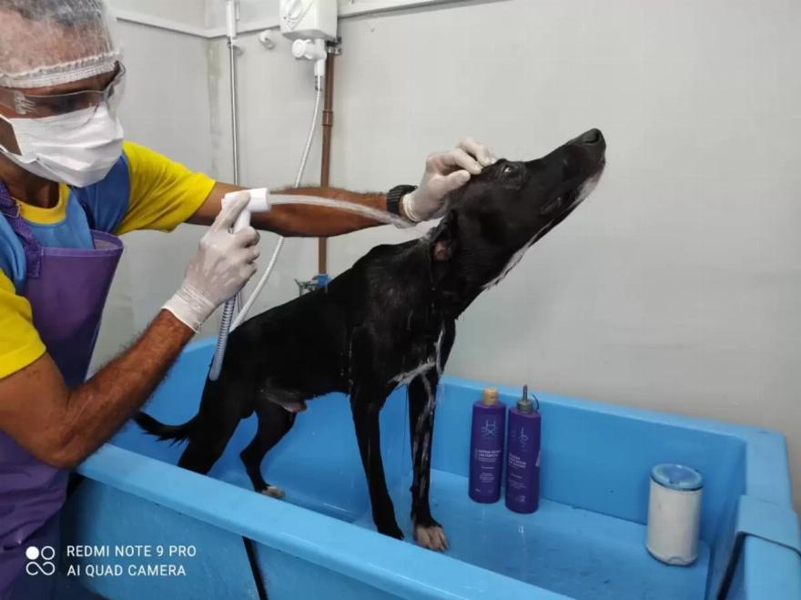Στον σκύλο έγινε ένα καθαριστικό μπάνιο και η Φερέιρα του έδωσε φαρμακευτική αγωγή. Αλλά περισσότερο από αυτό, αναζητώντας βοήθεια, ο μοναχικός σκύλος βρήκε κάτι ακόμη περισσότερο.