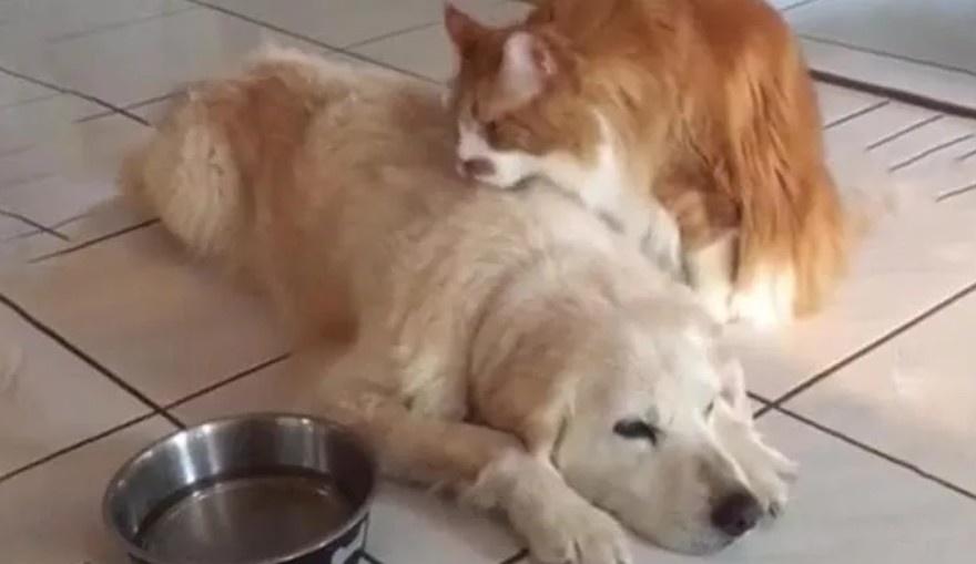 Σε ένα βίντεο που δημοσιεύτηκε, η γάτα πλησιάζει απαλά τον σκύλο και αρχίζει να γλείφει το κεφάλι του με φροντίδα, σα να του λέει ότι είναι δίπλα του.