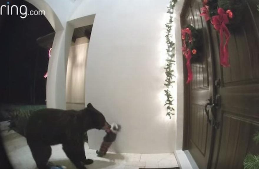 Στο αστείο βίντεο που κατέγραψε η κάμερα του κουδουνιού, μια μικρή μαύρη αρκούδα εμφανίζεται στη βεράντα της οικογένειας. Από περιέργεια αν υπήρχαν πιθανές λιχουδιές κρυμμένες στα χριστουγεννιάτικα στολίδια τα μυρίζει.