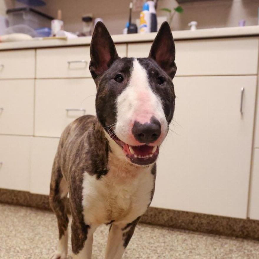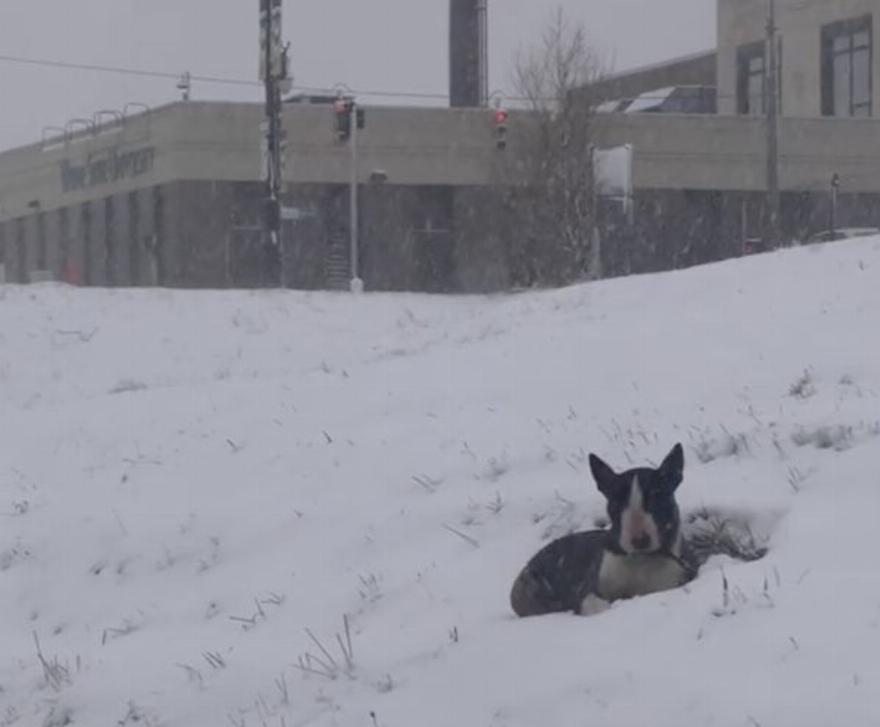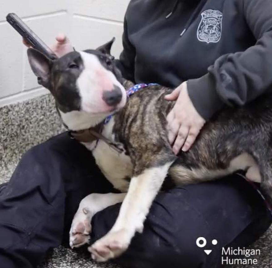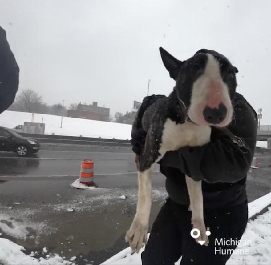 Ήταν μια χιονισμένη Παρασκευή όταν η Michigan Humane έλαβε μια κλήση για έναν σκύλο που εντοπίστηκε ξαπλωμένος στο χιόνι στην άκρη του αυτοκινητόδρομου I94. Καθώς η ομάδα οδήγησε στο σημείο του εντοπισμού είδε ένα ασπρόμαυρο μπουλ τεριέ να κοιτάζει κάτω από ένα ανάχωμα καθώς το χιόνι έπεφτε γύρω τους.