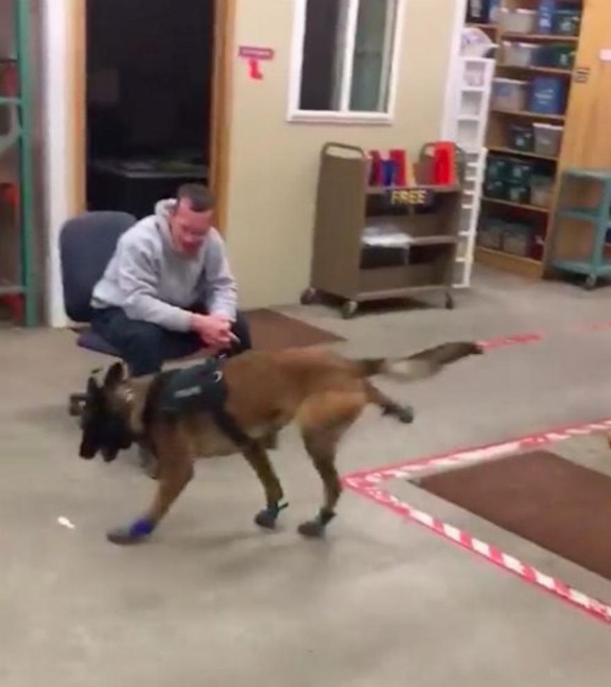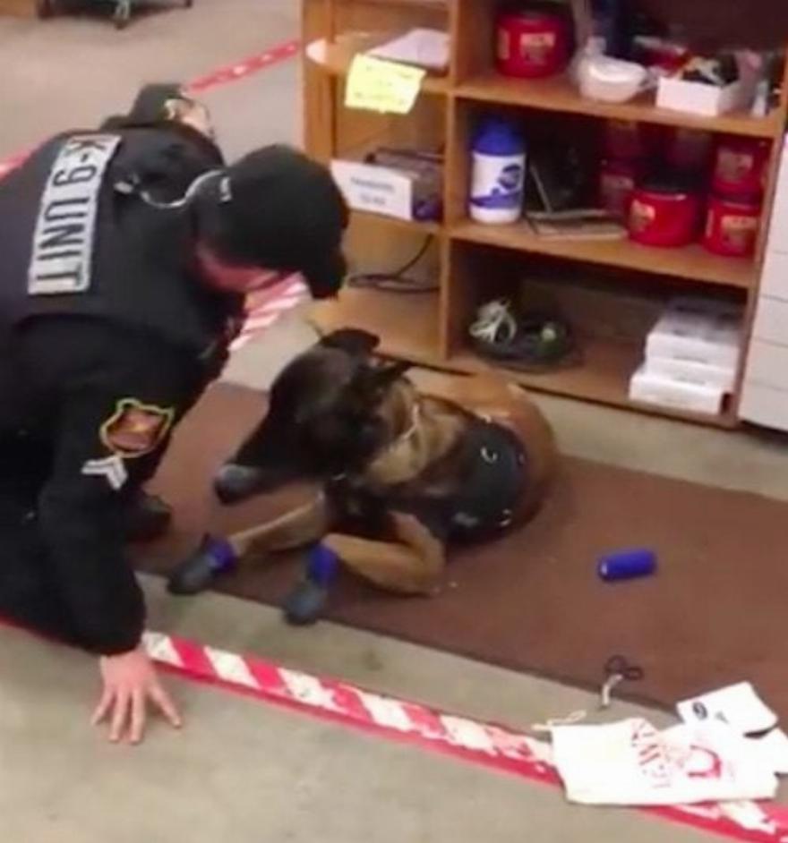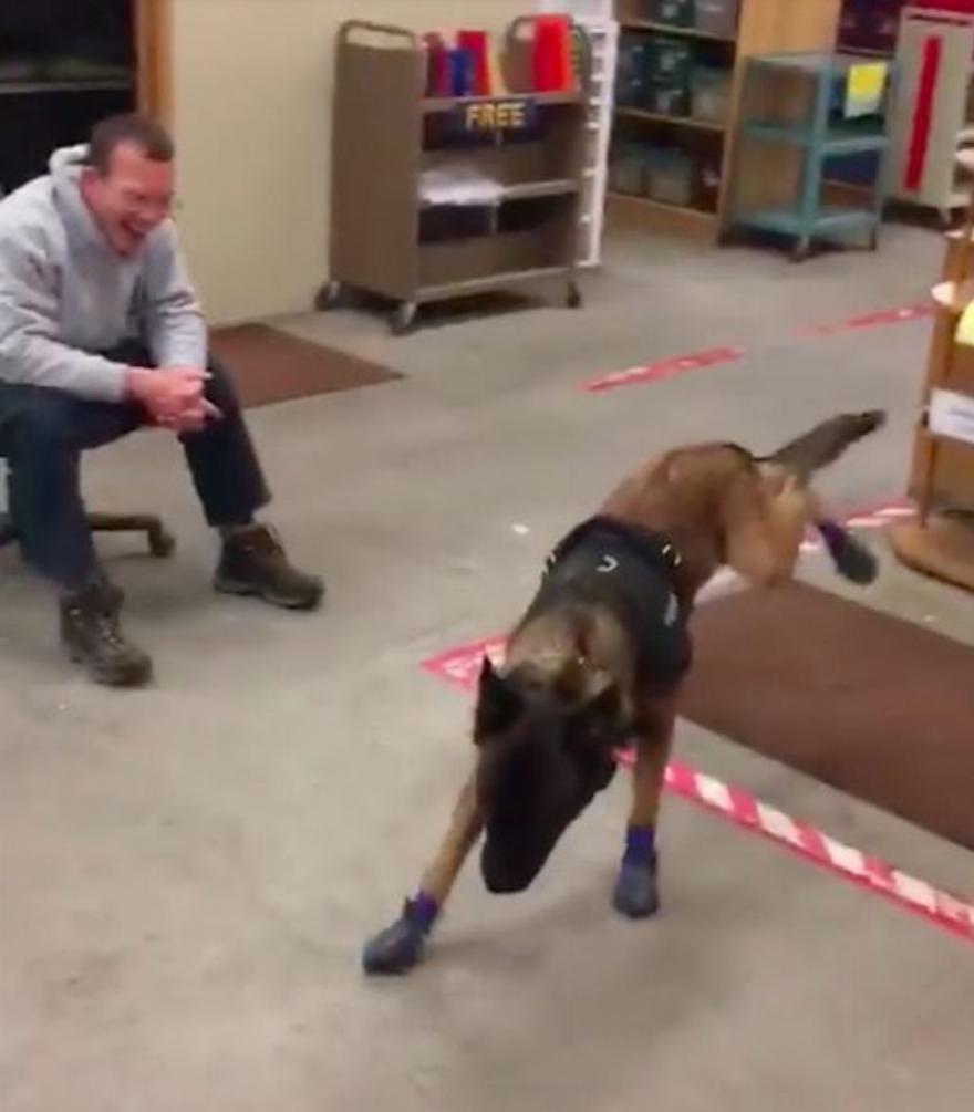Στο βίντεο ένας από τους αξιωματικούς K-9 χαμογελάει σε μια καρέκλα, καθώς ο Jary περνάει προσεκτικά.