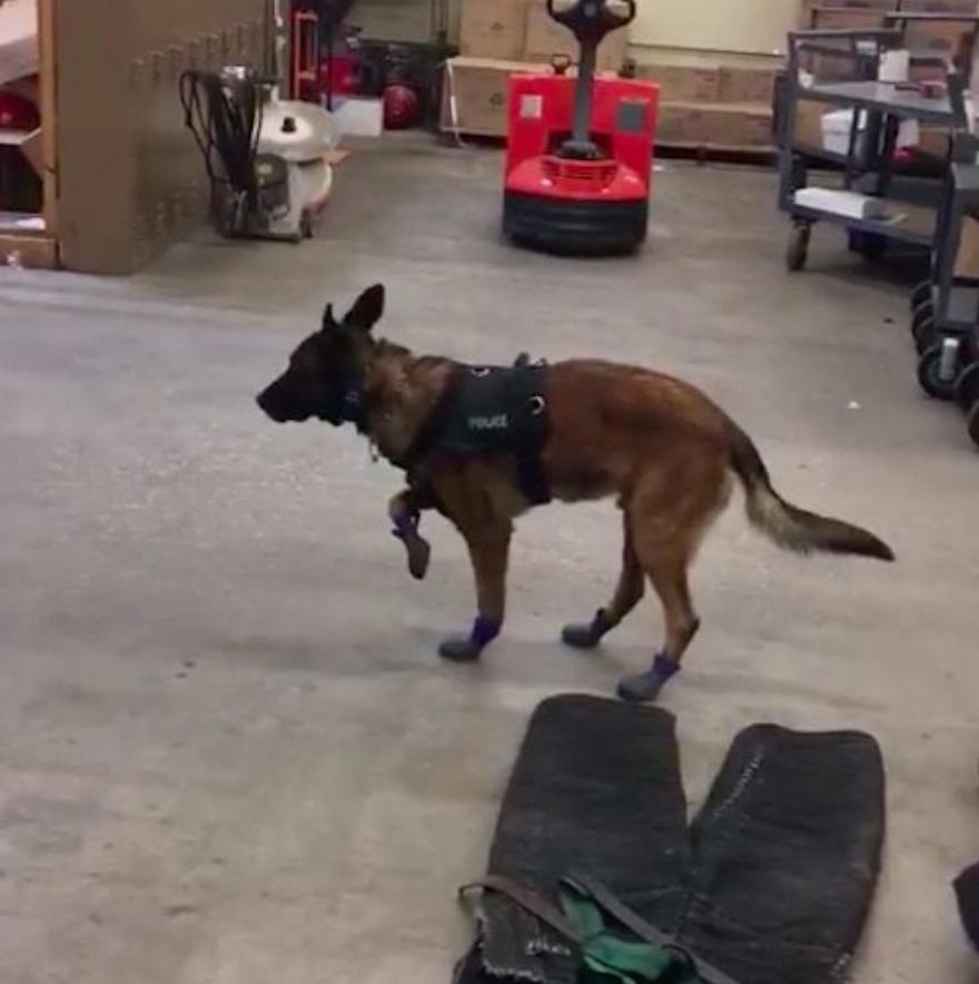 Το K9 δοκίμασε για πρώτη φορά την προστασία των ποδιών του και είναι σαφώς μπερδεμένο από τις μπότες.