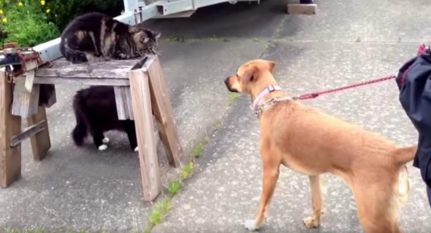 Ενώ βγήκαν για βόλτα μια ωραία ηλιόλουστη μέρα, ένας σκύλος και ο ιδιοκτήτης του σταμάτησαν για να χαιρετήσουν έναν γείτονα. Ο γείτονας έτυχε να είναι μια γάτα και ο σκύλος ήρθε πρόσωπο με πρόσωπο με τον αιλουροειδή φίλο του. Ευτυχώς, η μαμά του σκύλου κατέγραψε σε βίντεο ολόκληρο το πανηγύρι αγάπης. Μέσα σε λίγα δευτερόλεπτα μετά, τα πράγματα πήραν τη χειρότερη τροπή.