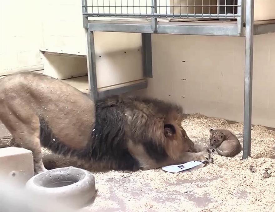 Ο μπαμπάς λιοντάρι σκύβει για να συναντήσει το μωρό του για πρώτη φορά σε αυτό το αξιολάτρευτο βίντεο