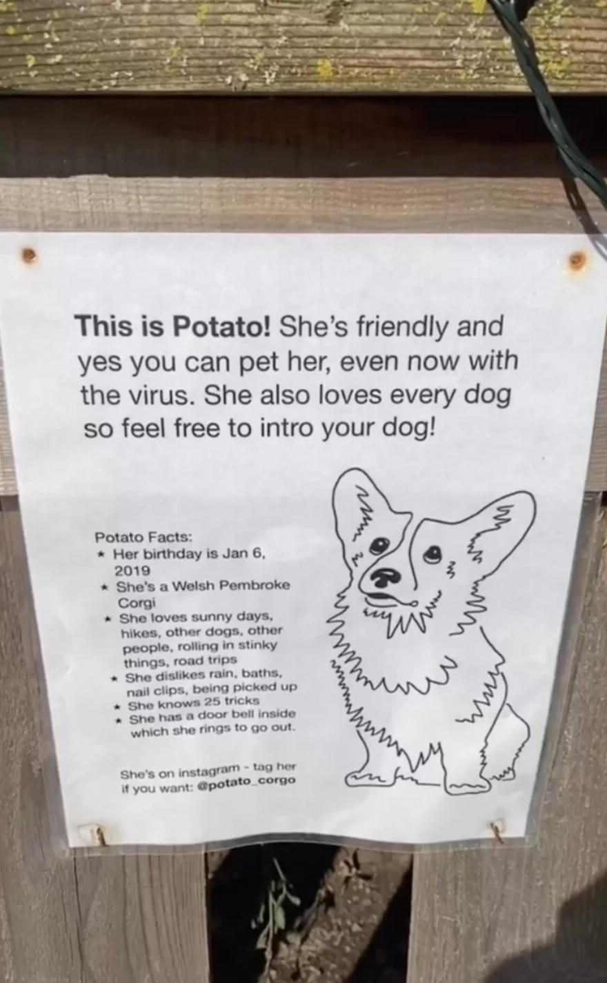 Οι γονείς της Potato ξόδεψαν χρόνο για να φτιάξουν το τέλειο εισαγωγικό σήμα για την Potato, κάτι χαριτωμένο και φιλικό που να αναδεικνύει την προσωπικότητά της. Την τοποθέτησαν στον φράχτη έξω από το σπίτι τους – και ξαφνικά, οι άνθρωποι αγαπούσαν την Potato ακόμα περισσότερο από ό,τι πριν.