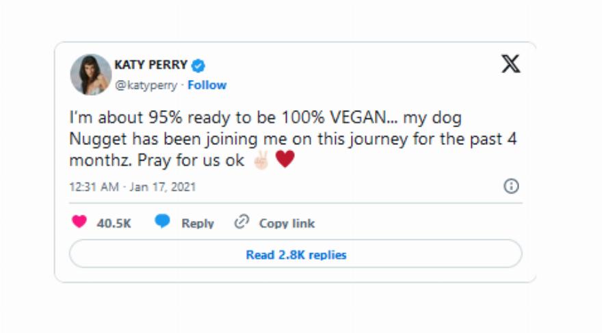 Σε πρόσφατη ανάρτησή της στο Twitter, η ποπ σταρ και μαμά Katy Perry έγραψε στο Twitter ότι είναι έτοιμη να ξεκινήσει μια εντελώς χορτοφαγική διατροφή, προσθέτοντας ότι ο σκύλος της Nugget συμμετέχει στο χορτοφαγικό “ταξίδι” της εδώ και αρκετούς μήνες.