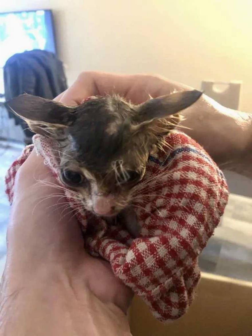 Το γατάκι, που αργότερα ονομάστηκε Meatball, ήταν μόλις αρκετά μεγάλο για να φάει στερεά τροφή, πόσο μάλλον για να επιβιώσει μόνο του.
