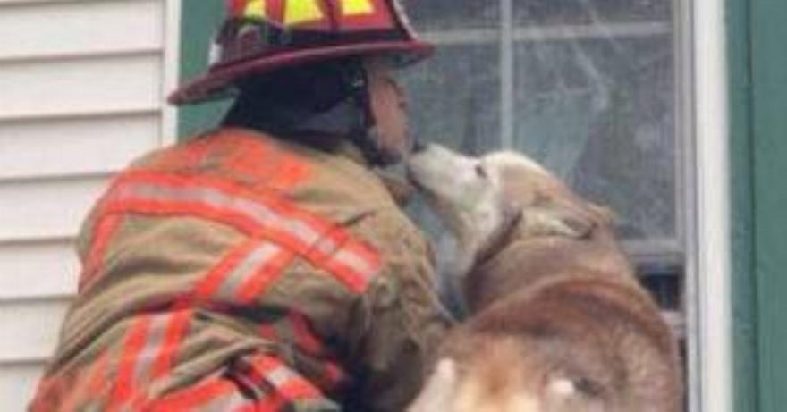 Μια συγκινητική σκηνή καθώς ένας σκύλος γλείφει στοργικά το πρόσωπο ενός πυροσβέστη που τον έσωσε από μια ταράτσα.