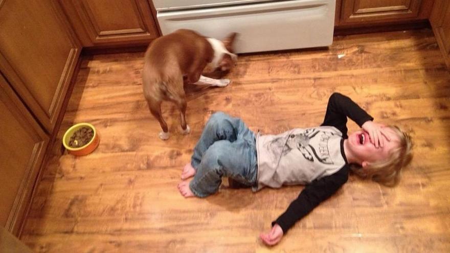 Σε τέτοιες στιγμές, ο σκύλος της οικογένειας αναλαμβάνει δράση για να τον ηρεμήσει! Στη συνέχεια, κοιτάζει με αγάπη τον ιδιοκτήτη του. Το αγόρι ξεχνάει τα πάντα και αρχίζει να γελάει.