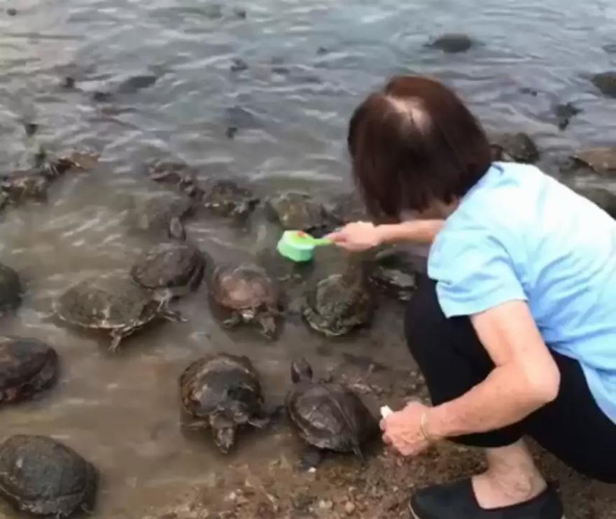 Μπροστά από την κυρία, δεκάδες χελώνες έβγαιναν με ανυπομονησία από το νερό – παρατάσσονταν για να τις τρίψει.