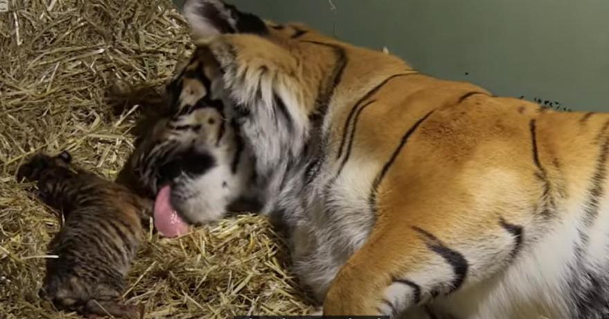 Μια εξαιρετικά σπάνια στιγμή ανάμεσα σε μια θηλυκή τίγρη που ονομάζεται Kaitlyn και τα 2 νεογέννητα μικρά της που δεν αντιδρούν, κατέγραψε η κάμερα από το προσωπικό του ζωολογικού κήπου της Αυστραλίας. Η μαμά τίγρη της Σουμάτρας άρχισε να γλείφει τα δίδυμα μωρά μέχρι που τελικά ανέπνευσαν ξανά!