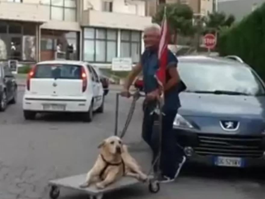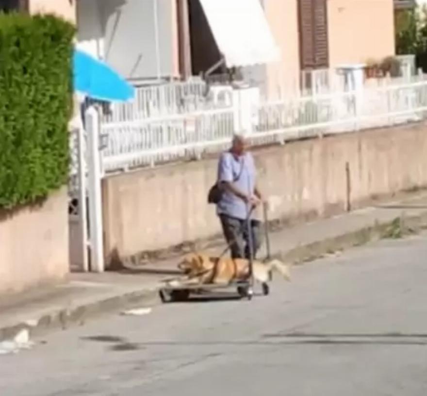 Εκεί, σε έναν ήσυχο δρόμο στην πόλη Vibo Valentia, ήταν ένας ηλικιωμένος κύριος που έσπρωχνε τον σκύλο του σε ένα καρότσι, το κουτάβι προφανώς δεν μπορούσε να μετακινηθεί μόνο του. Η Grotteria άρχισε να καταγράφει ένα βίντεο καθώς το ζευγάρι έφτανε στο σπίτι στο τέλος μιας βόλτας.