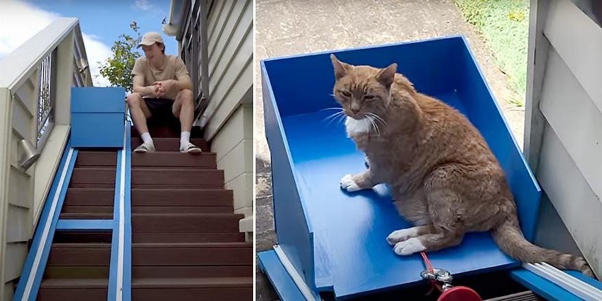 Οι ιδιοκτήτες κατοικίδιων ζώων είναι διατεθειμένοι να κάνουν τα πάντα για να παρατείνουν τη ζωή των αγαπημένων τους συντρόφων. Έτσι, ένας ιδιοκτήτης γάτας έφτιαξε έναν αυτοσχέδιο ανελκυστήρα για να βοηθά την ηλικιωμένη γάτα του να ανεβοκατεβαίνει τα σκαλιά του σπιτιού χωρίς δυσκολία.
