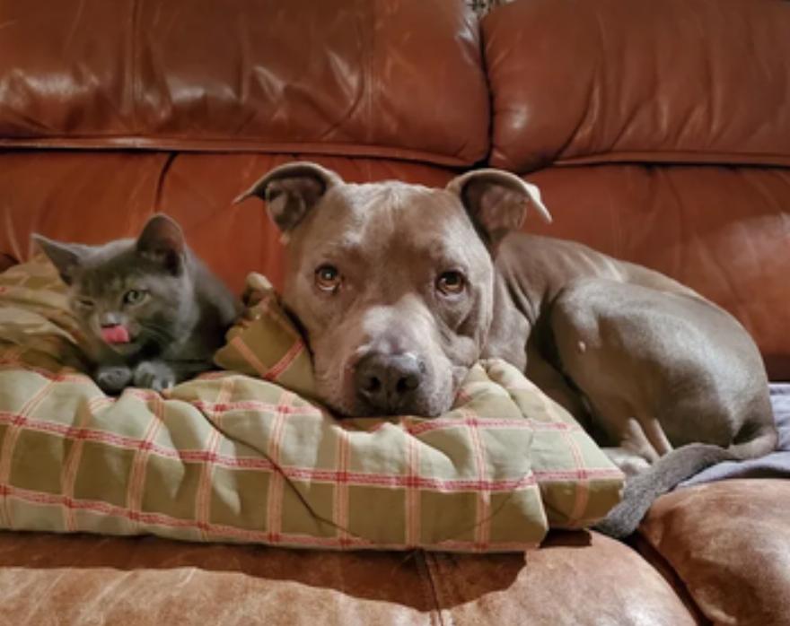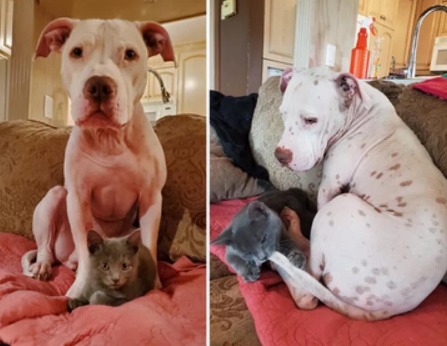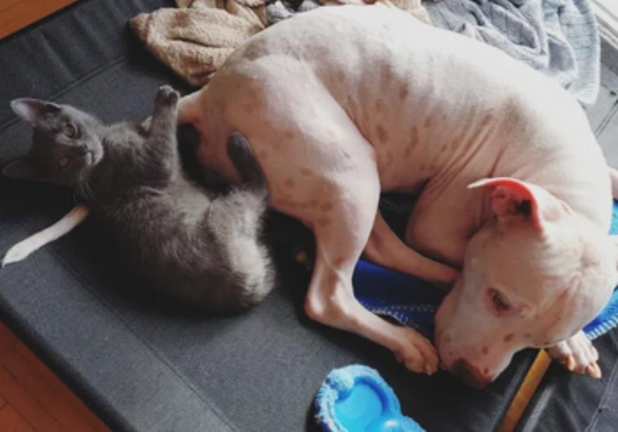 Ο Gunner, ο γλυκός 7χρονος σκύλος, ήταν τόσο χαρούμενος που μοιράστηκε μια κουβέρτα με αυτό το μικρό αιλουροειδές φιλαράκι.