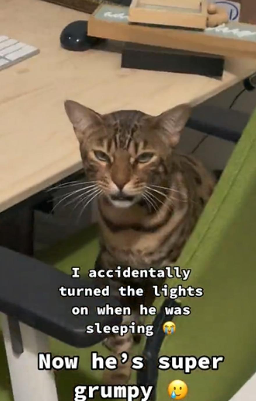“Κατά λάθος άναψα τα φώτα όταν κοιμόταν”, γράφει το κείμενο στο βίντεο. “Είναι σούπερ γκρινιάρης”.