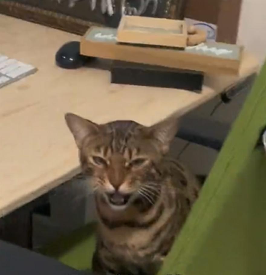 Καθισμένος σε μια πράσινη καρέκλα, ο Pokie νιαουρίζει, το πιο θυμωμένο νιαούρισμα, κάνοντας ξεκάθαρο ότι δεν είναι ενθουσιασμένος που τον ξύπνησαν.