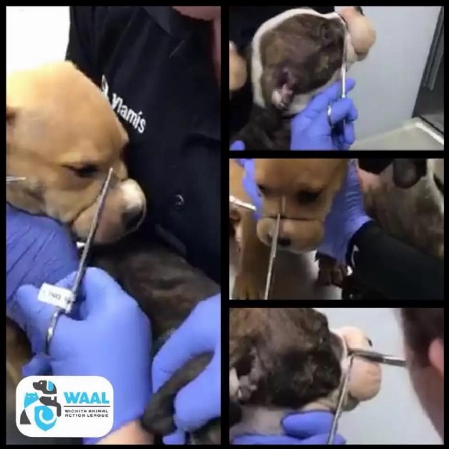 “Υπήρχαν περιττώματα και ούρα που απλά ξεχείλιζαν από το μπροστινό μέρος του κυνοκομείου”, δήλωσε στο The Dodo η Sarah Coffman, εκτελεστική διευθύντρια του Wichita Animal Action League. “Στη συνέχεια παρατήρησε ότι τα κουτάβια δεν μπορούσαν να ανοίξουν το στόμα τους – έτσι έριξε έναν φακό στο κλουβί και συνειδητοποίησε ότι είχαν κάτι τυλιγμένο γύρω από τις μουσούδες τους και ότι οι μύτες τους ήταν πραγματικά πρησμένες και κόκκινες”.