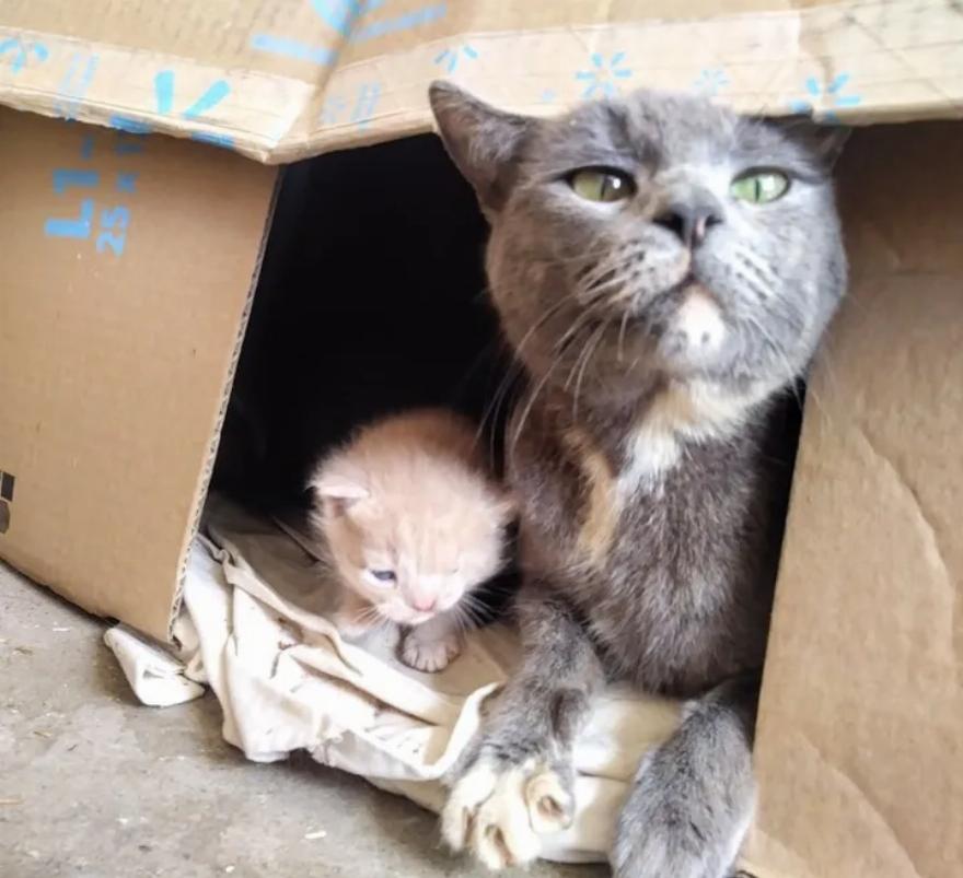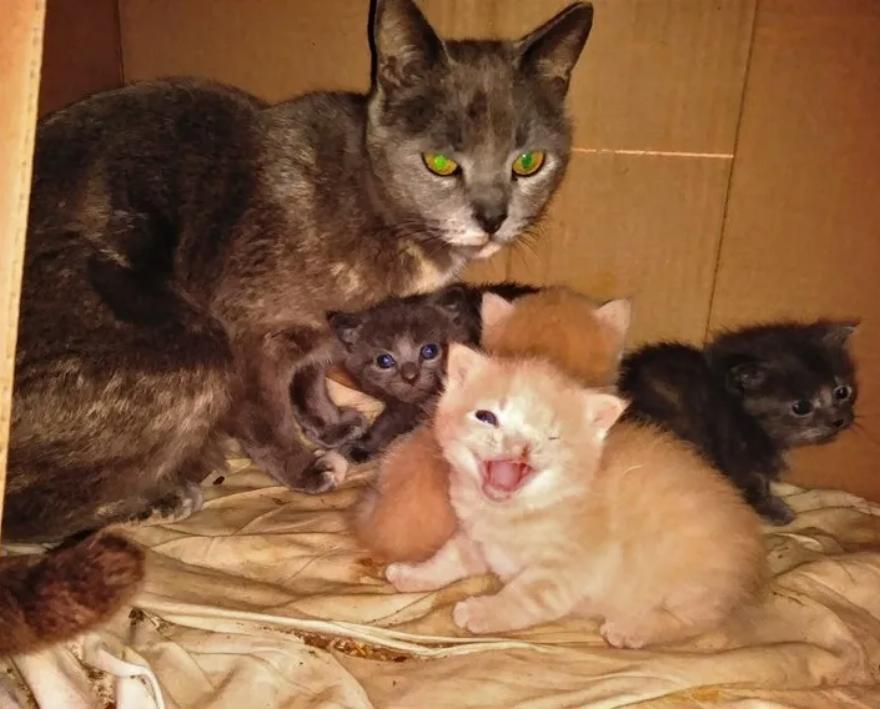 Η γάτα περιπλανήθηκε στην μπροστινή βεράντα του σπιτιού ενός κατοίκου, όπου ανακάλυψαν μερικά χαρτόκουτα μαζί με κάποια άλλα μπάζα. Έψαξαν στην περιοχή, ελπίζοντας να εντοπίσουν τη φωλιά. “Και ιδού, μέσα σε ένα παλιό χτυπημένο χαρτόκουτο, υπήρχαν τέσσερις μικρές χνουδωτές μπάλες”.