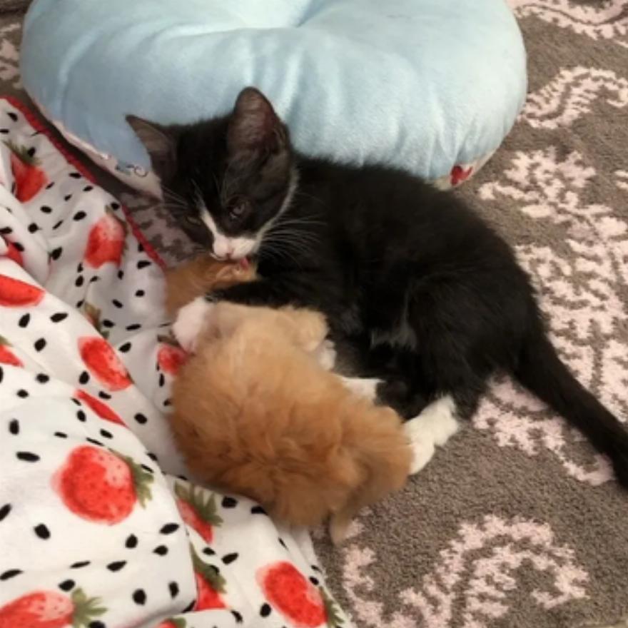 Γνωρίζοντας ότι χρειαζόταν έναν φίλο, αποφάσισαν να τον συστήσουν σε άλλα ανάδοχα γατάκια της ηλικίας του.