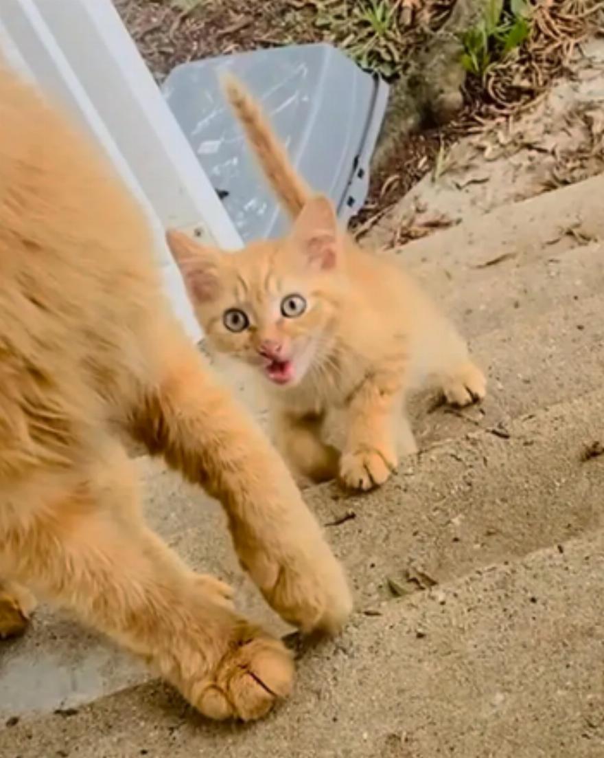 Έφερε μαζί της ένα τζίντζερ γατάκι, μια μίνι εκδοχή του εαυτού της. Το γατάκι ακολουθούσε τη μητέρα του και ανυπομονούσε να φάει. Το επόμενο βράδυ, η μαμά γάτα επέστρεψε και εξέπληξε τον ανθρώπινο φίλο της με όχι μόνο ένα, αλλά δύο μικρά πεινασμένα γατάκια για να ταΐσει.