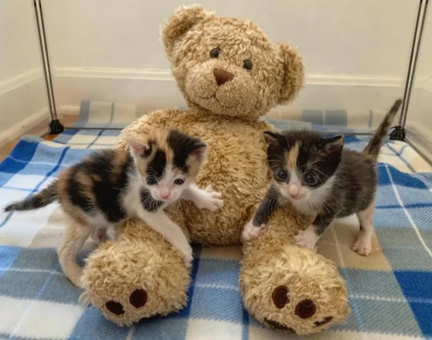 Η Sarah τους έδωσε ένα χαριτωμένο αρκουδάκι για να τους κρατάει συντροφιά. Οι calico αδελφές το αγκάλιασαν αμέσως.