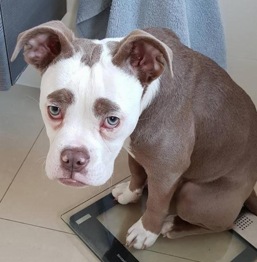 Το πρόσωπό της μοιάζει συνοφρυωμένο λόγω των βαθιών σημαδιών ακριβώς πάνω από τα μάτια της, που τα κάνουν να μοιάζουν με φρύδια! Η Janina δήλωσε ότι αγάπησε το σκυλί από τη στιγμή που το είδε και το υιοθέτησε άμεσα και το ονόμασε Madame Eyebrows λόγω της εμφάνισης των φρυδιών της.