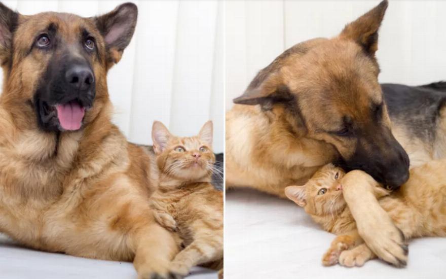 Παίζουν, αγκαλιάζονται, πίνουν και τρώνε μαζί-είναι αχώριστοι καθώς η κοκκινομάλλα γάτα μεγαλώνει όλο και περισσότερο με την άνεση του σκύλου προστάτη της.