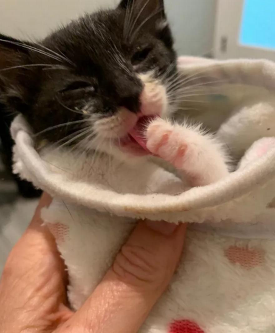 Το γατάκι είχε ένα σοβαρά μολυσμένο μάτι, αλλά ήταν τόσο χαρούμενο που ήταν ασφαλές. Μεταφέρθηκε στο Alley Cat Rescue όπου έλαβε την ιατρική φροντίδα που χρειαζόταν απεγνωσμένα.
