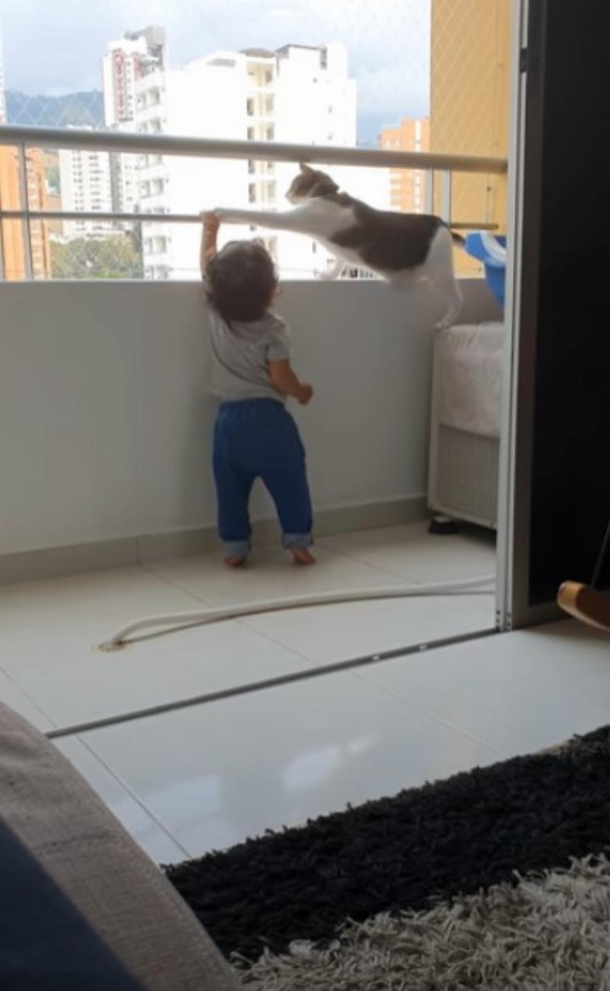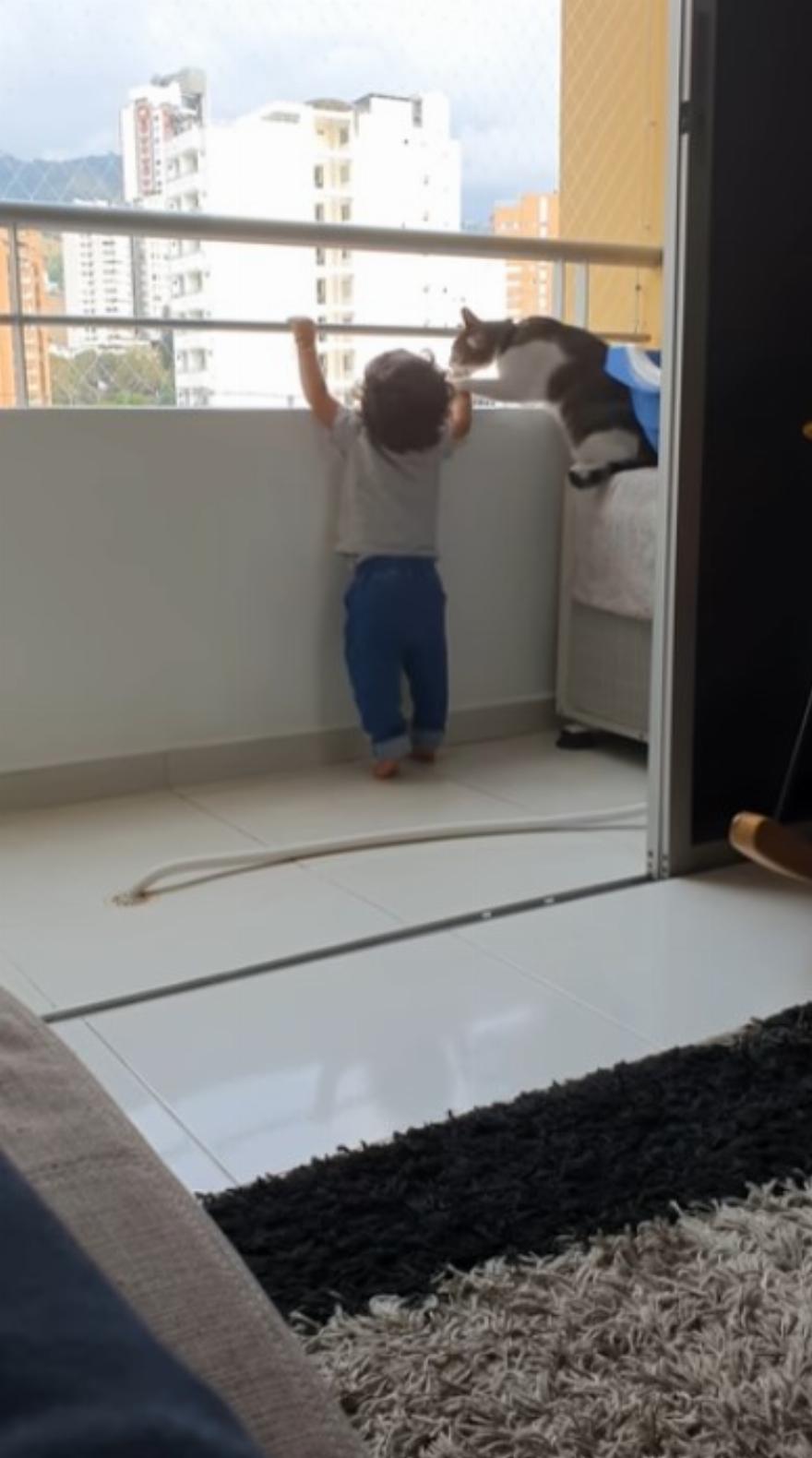 Η όλη αλληλεπίδραση καταγράφηκε από την κάμερα, η οποία παρακολουθούσε σε κοντινή απόσταση. Ευτυχώς, η ζωή του παιδιού δεν κινδύνευσε ποτέ πραγματικά λόγω του πλέγματος ασφαλείας που καλύπτει το μπαλκόνι. Αλλά η γενναία γάτα σίγουρα αξίζει το βραβείο “καλύτερης μπέιμπι σίτερ της χρονιάς”.