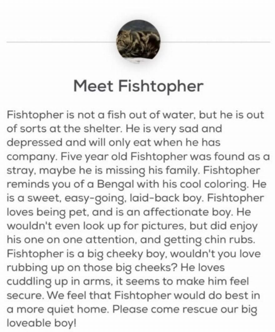 Το προφίλ τελείωνε με μια περιγραφή του είδους του σπιτιού στο οποίο το προσωπικό του καταφυγίου πίστευε ότι ο Fishtopher θα τα πήγαινε καλύτερα και μια πρόσκληση για δράση που ελπίζουμε να εμπνεύσει την κατάλληλη οικογένεια.