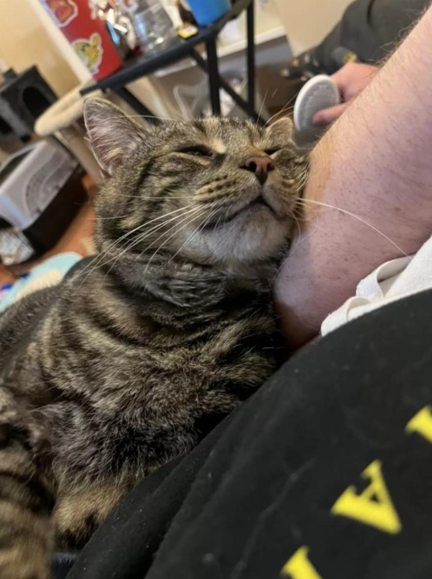 “Τα αγαπημένα του πράγματα: ο καναπές και οι λιχουδιές από το σωληνάριο πουρέ!” έγραψε η Folts. “Κυρίως χαίρεται που παίρνει λιχουδιές”.