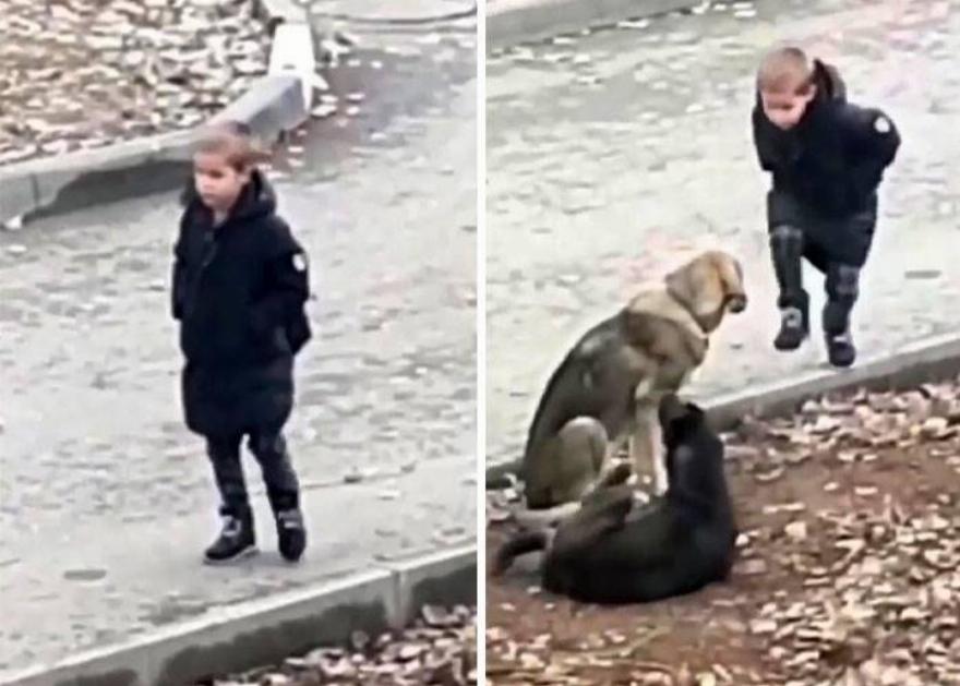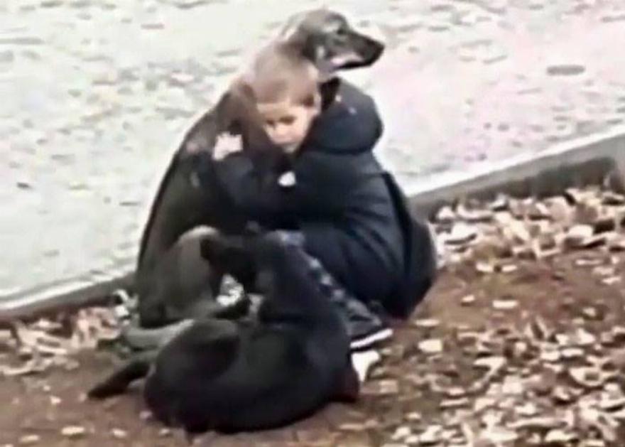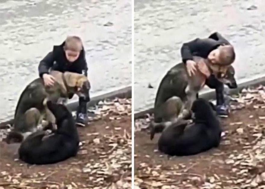 Ένα βίντεο έχει γίνει ανάρπαστο στο διαδίκτυο, που δείχνει ένα μικρό αγόρι να αγκαλιάζει και να χαϊδεύει δύο αδέσποτα σκυλιά στο πεζοδρόμιο